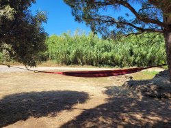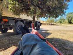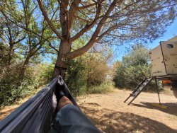 Mittagspause auf einem Parkplatz in der Natur. Die Grille hält ein Ständchen im viertelstunden Takt. Der Planet am Himmel lässt die Temperatur sehr stark ansteigen. In der Hängematte läßt es sich gerade so aushalten.
